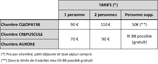 Les tarifs s’entendent TTC pour 1 nuit, petit déjeuner, frais de ménage et taxe de séjour inclus.